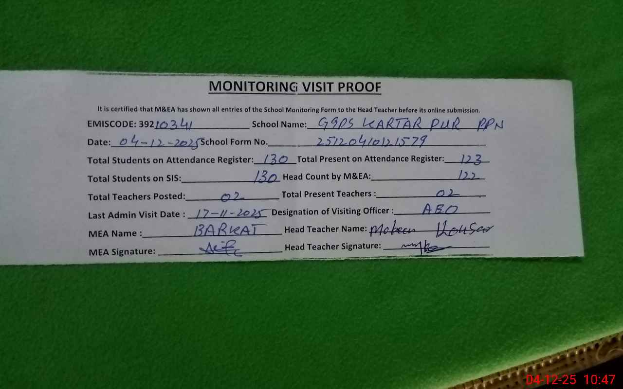 | EMIS Code: 39210341 | Name of School: GGPS KARTAR PUR PAKPATTAN | |||