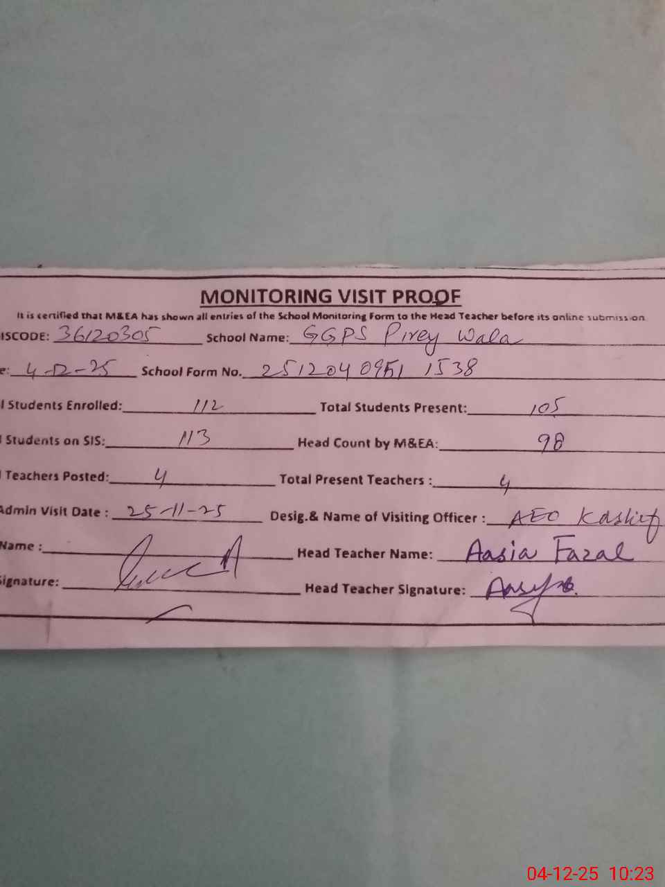 | EMIS Code: 36120305 | Name of School: GGPS PIREY WALA NO.1 TEH. SHUJABAD | |||