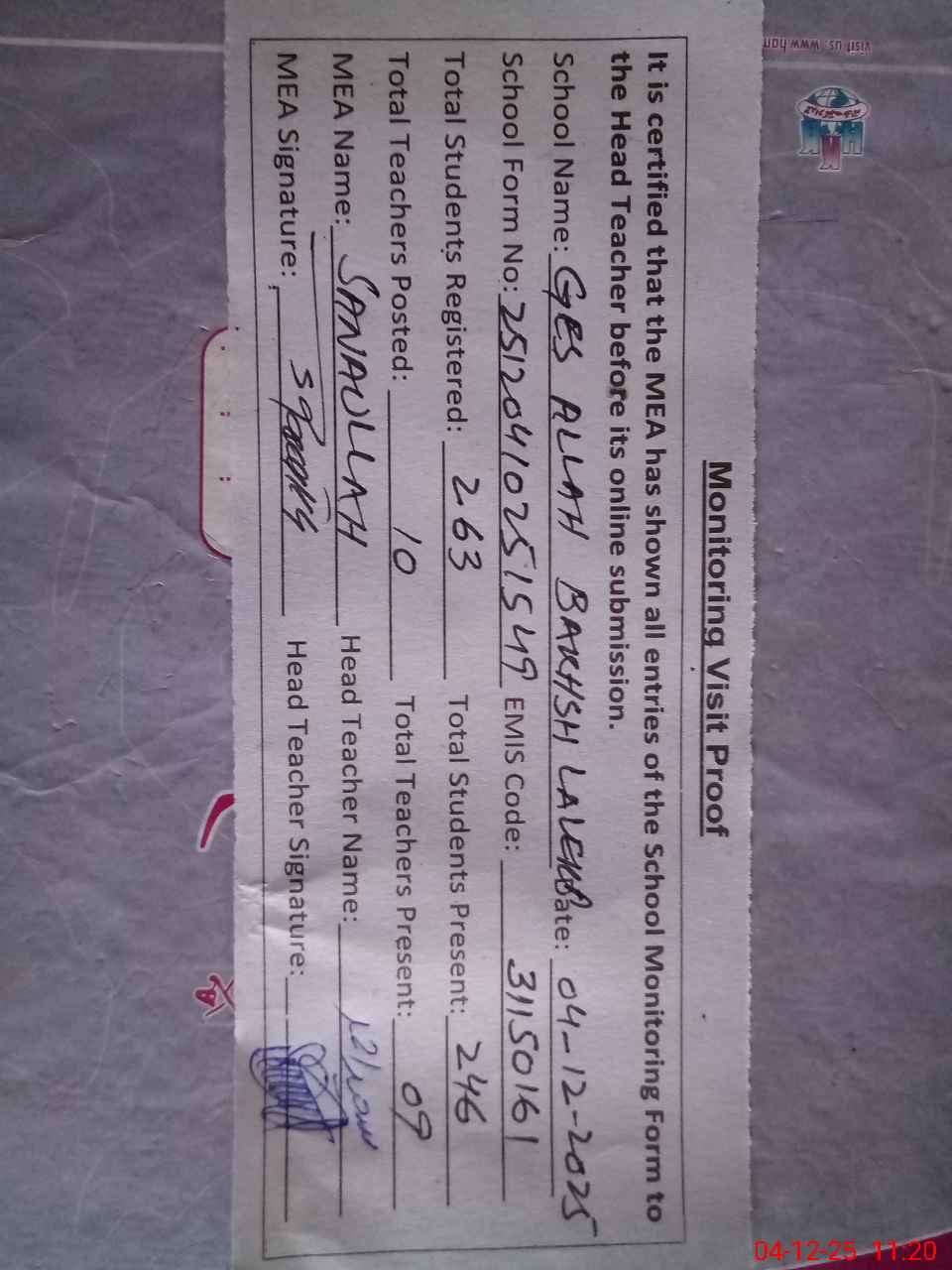 | Attendance Register | Head Teacher | MEA with School | Visit Proof |