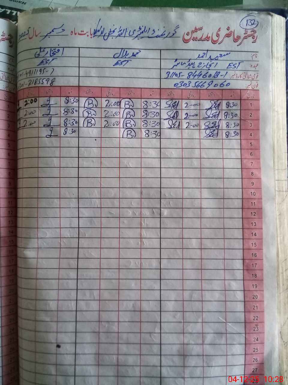 | CNIC | Full Name | Designation | R/C | Absence During Last Calender Month |