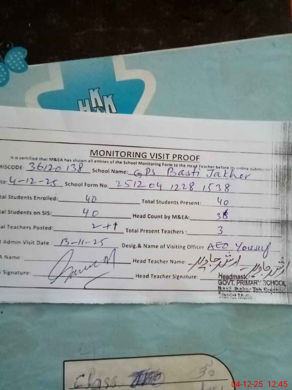 | Attendance Register | Head Teacher | MEA with School | Visit Proof |