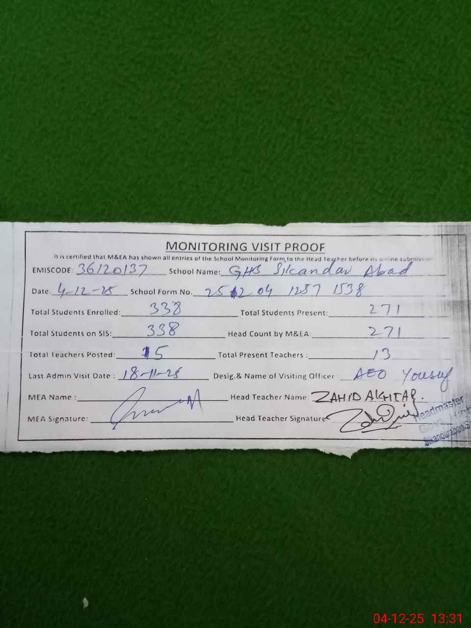 | EMIS Code: 36120137 | Name of School: GHS SIKANDER ABAD SHUJABAD | |||