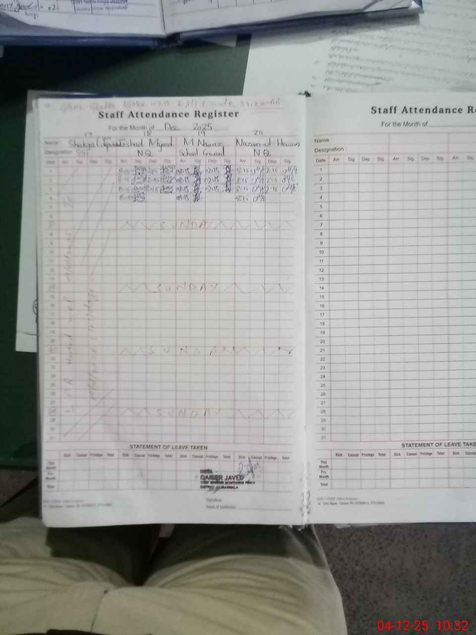 | CNIC | Full Name | Designation | R/C | Absence During Last Calender Month |