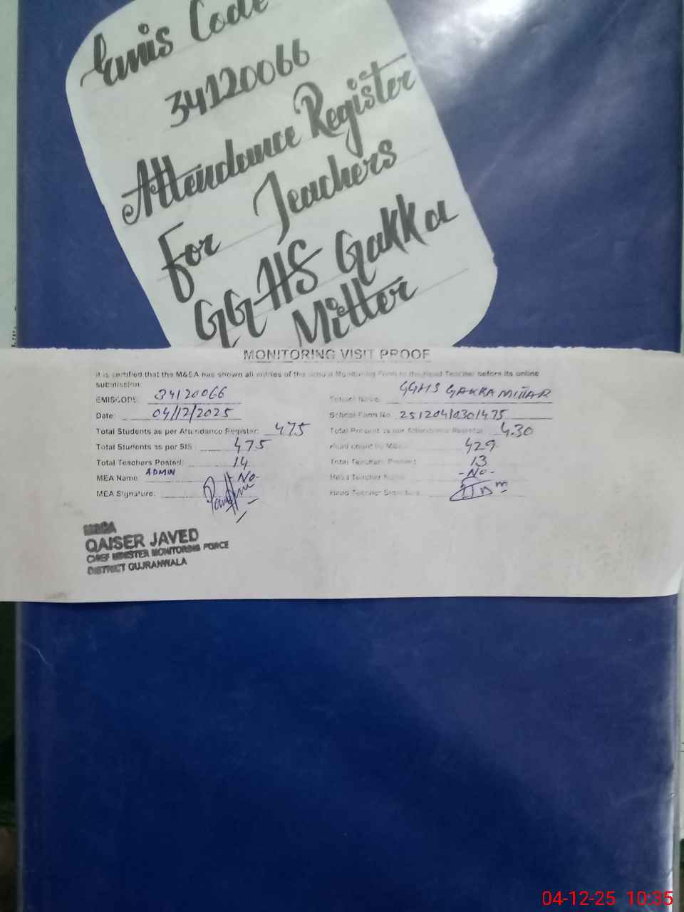 | Attendance Register | Head Teacher | MEA with School | Visit Proof |
