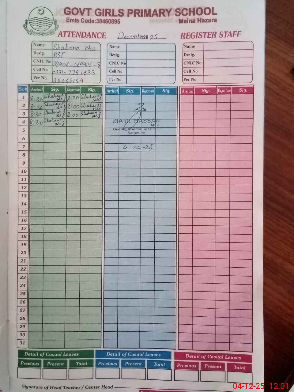 | CNIC | Full Name | Designation | R/C | Absence During Last Calender Month |
