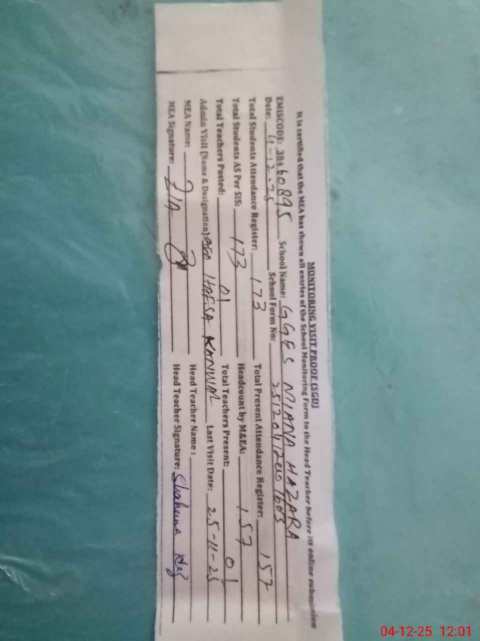 | Attendance Register | Head Teacher | MEA with School | Visit Proof |