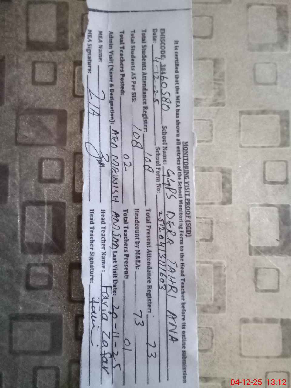 | EMIS Code: 38460580 | Name of School: GGPS DERA TAHARI ANA | |||
