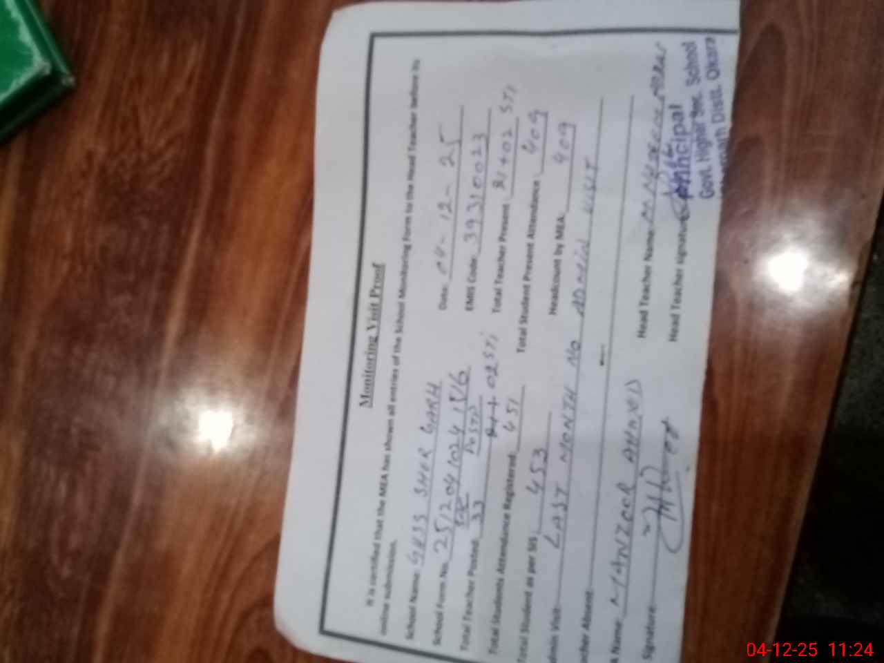 | Attendance Register | Head Teacher | MEA with School | Visit Proof |