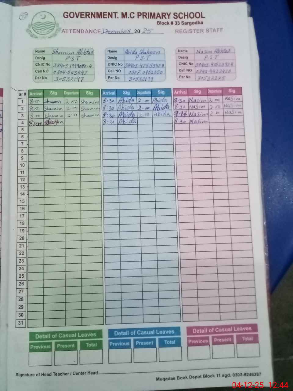 | CNIC | Full Name | Designation | R/C | Absence During Last Calender Month |