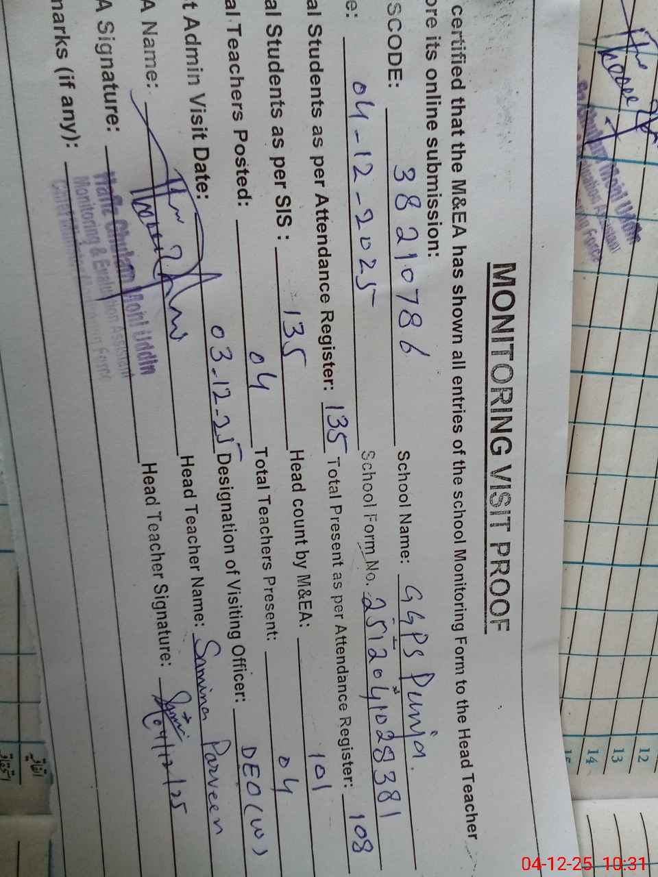 | Remarks (Use Separate Page if Required): last visit by DEO (W)03 December 2025 | |||||