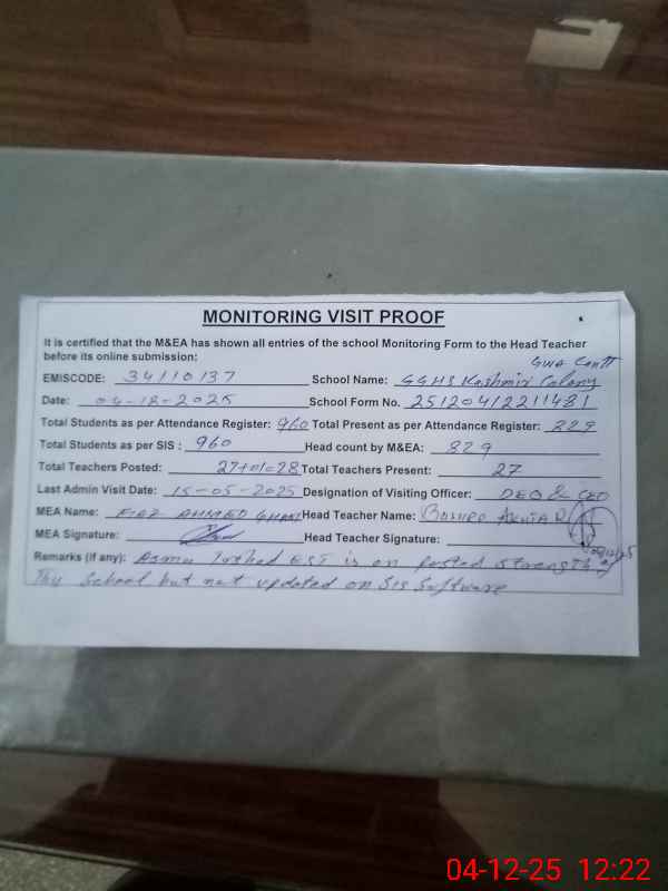 | EMIS Code: 34110137 | Name of School: GGHSS KASHMIR COLONY GUJRANWALA CANTT | |||