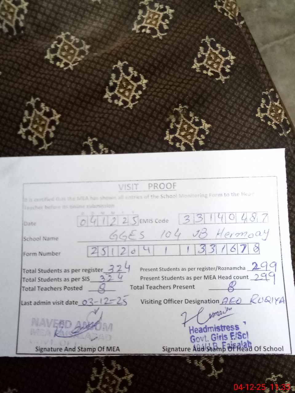 | EMIS Code: 33140487 | Name of School: GGES CHAK 104 JB HER MOAY | |||