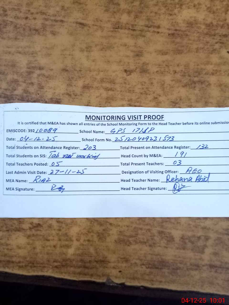 | Attendance Register | Head Teacher | MEA with School | Visit Proof |