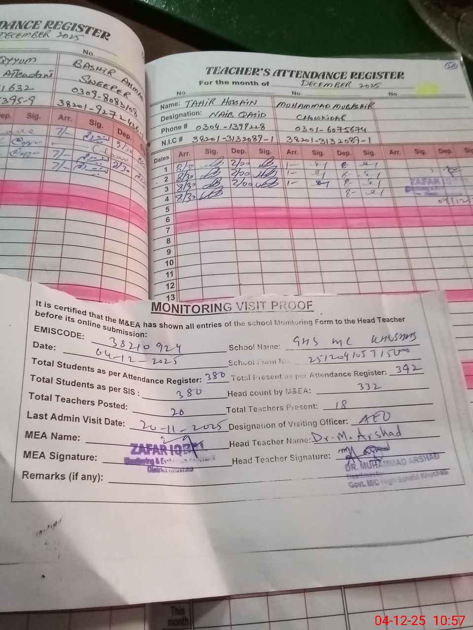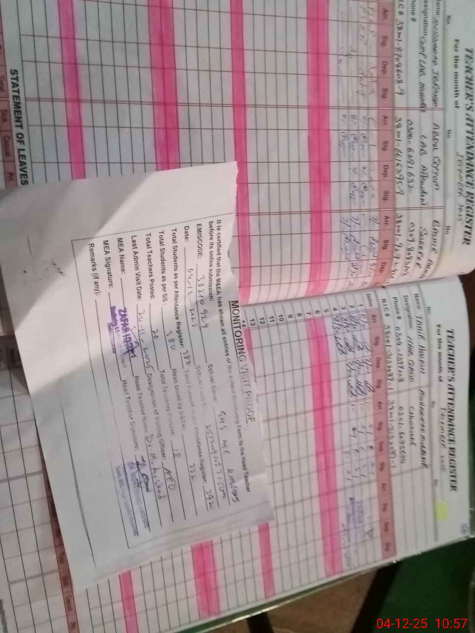 | Attendance Register | Head Teacher | MEA with School | Visit Proof |