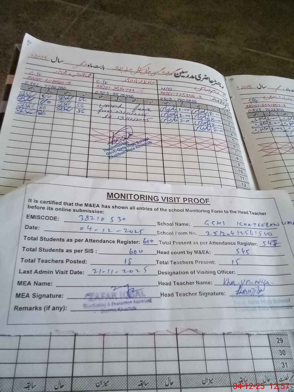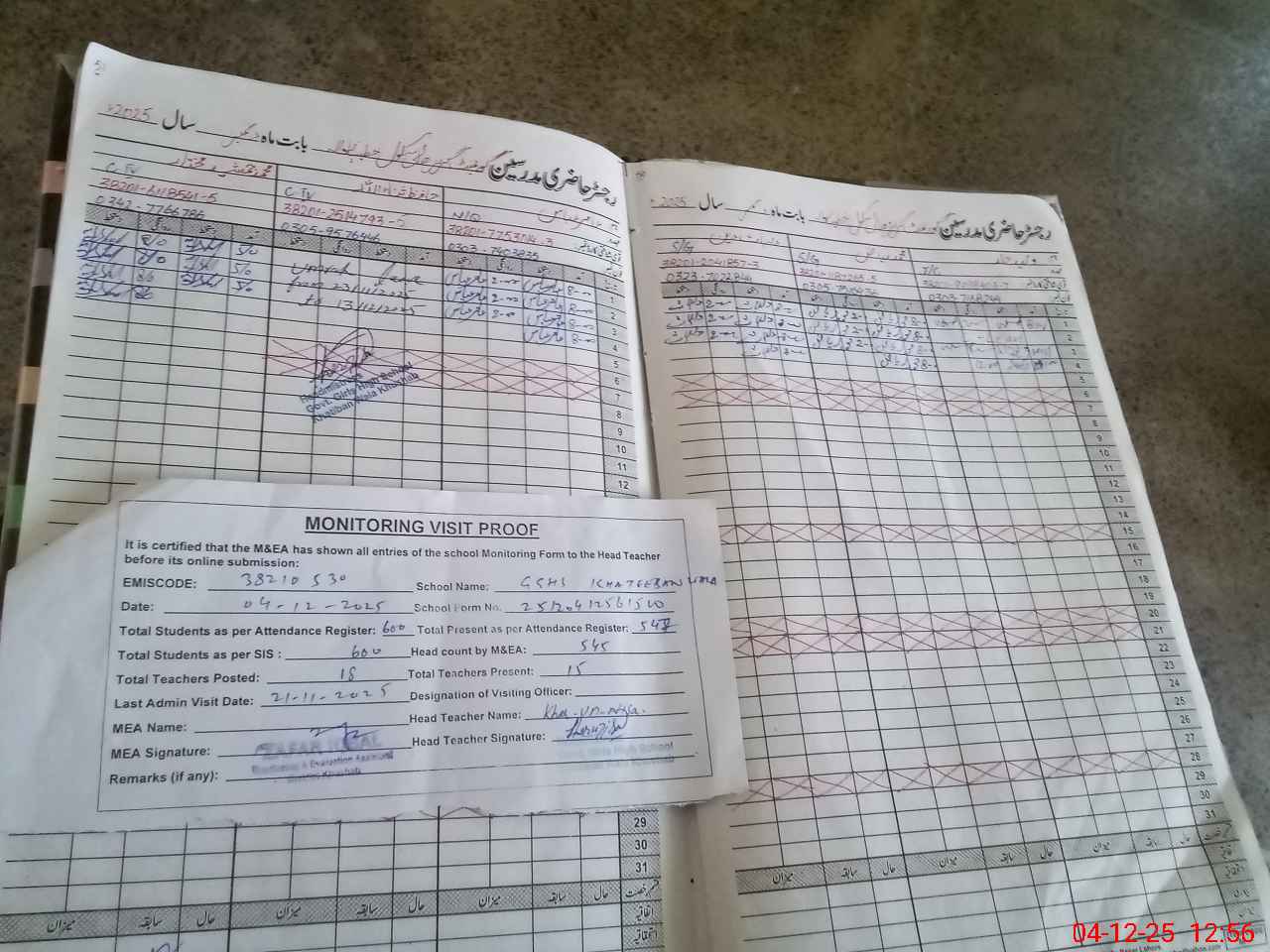 | Attendance Register | Head Teacher | MEA with School | Visit Proof |