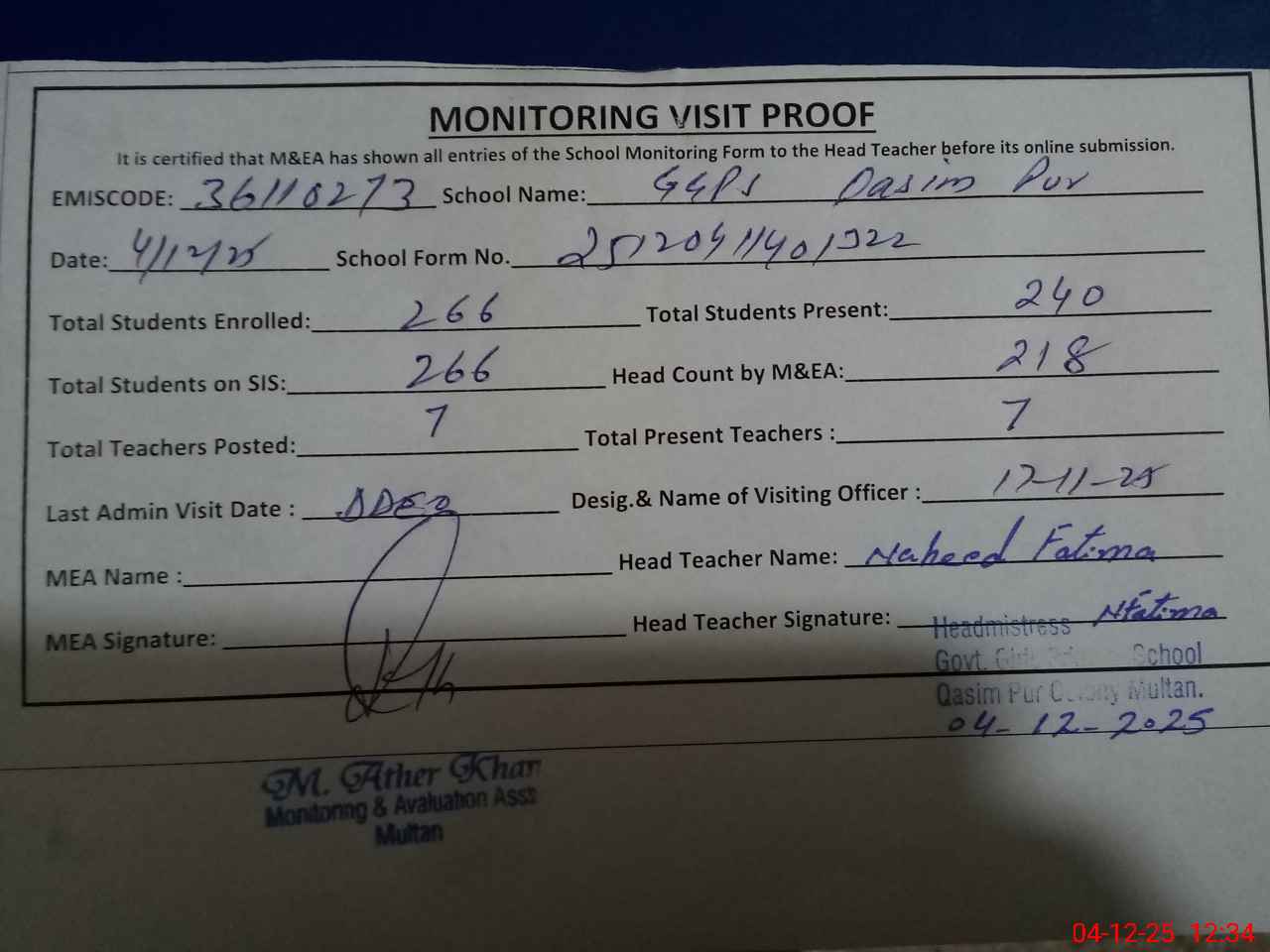 | Attendance Register | Head Teacher | MEA with School | Visit Proof |