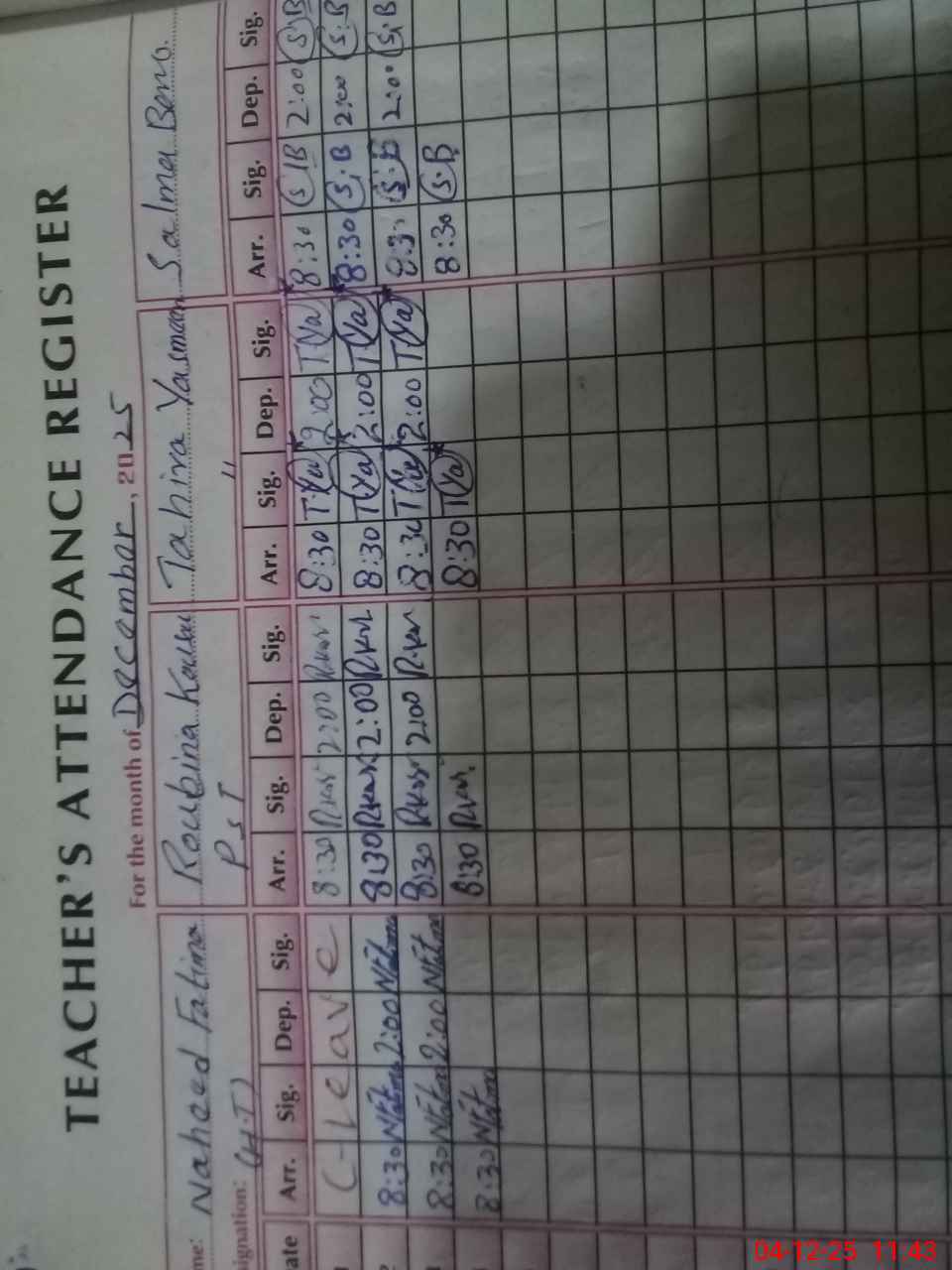 | CNIC | Full Name | Designation | R/C | Absence During Last Calender Month |