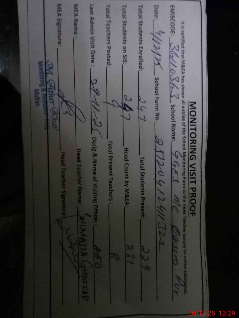 | EMIS Code: 36110363 | Name of School: GGES MC QASIM PUR COLONY MULTAN | |||
