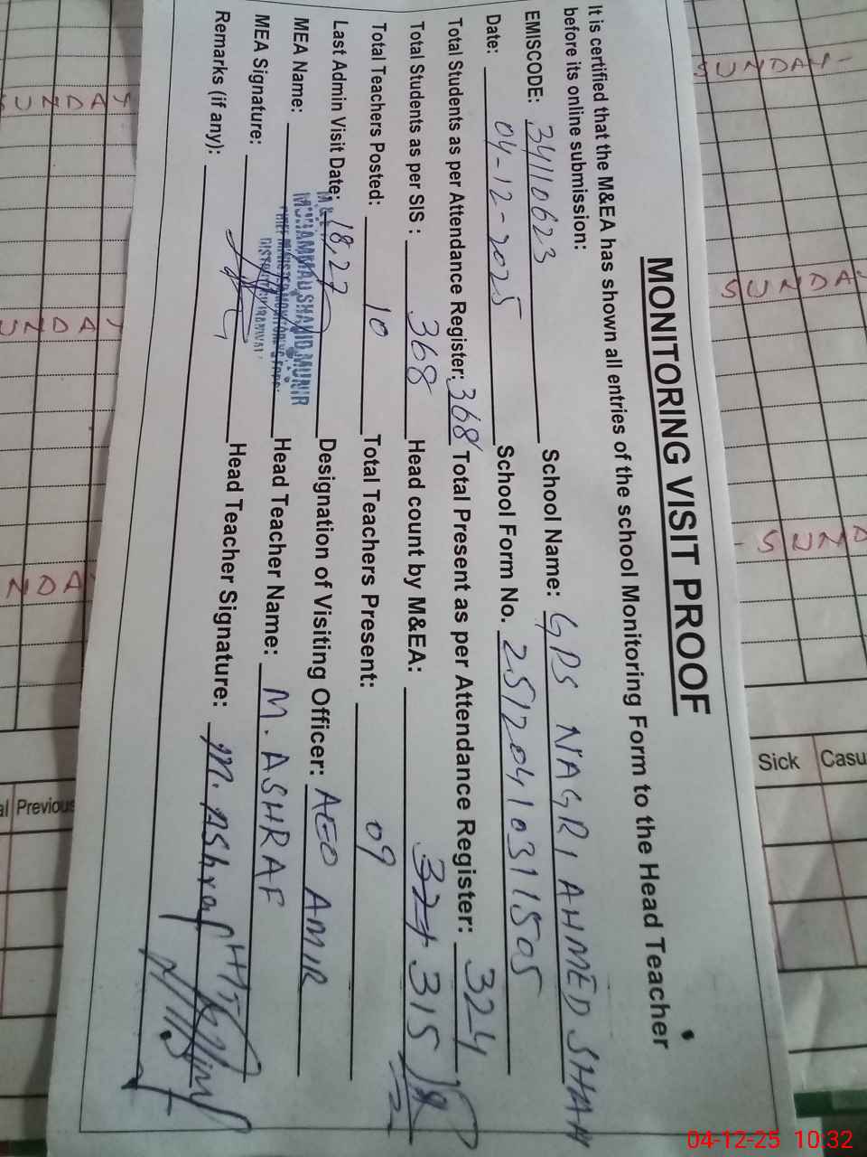 | EMIS Code: 34110623 | Name of School: GPS NAGRI AHMED SHAH | |||