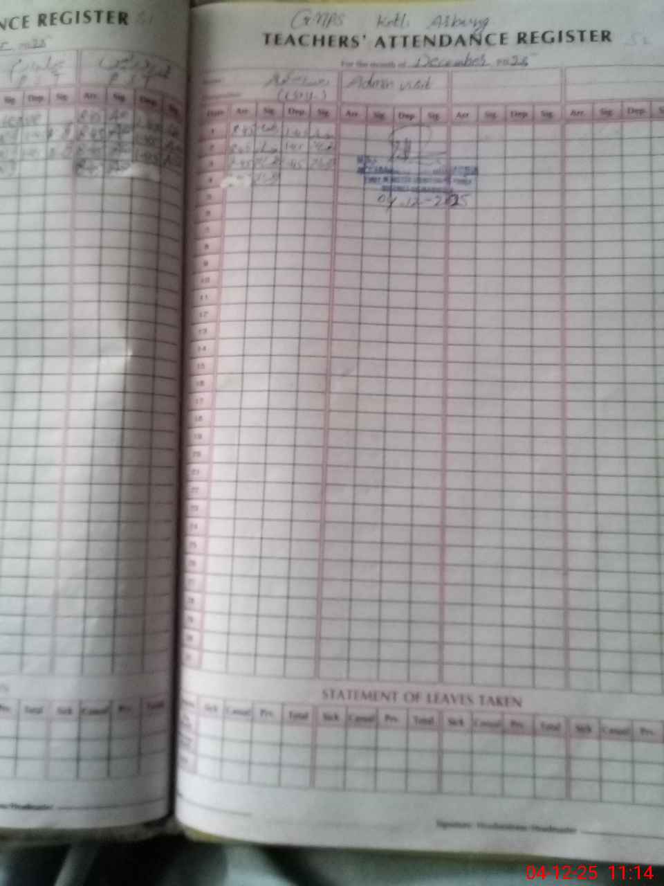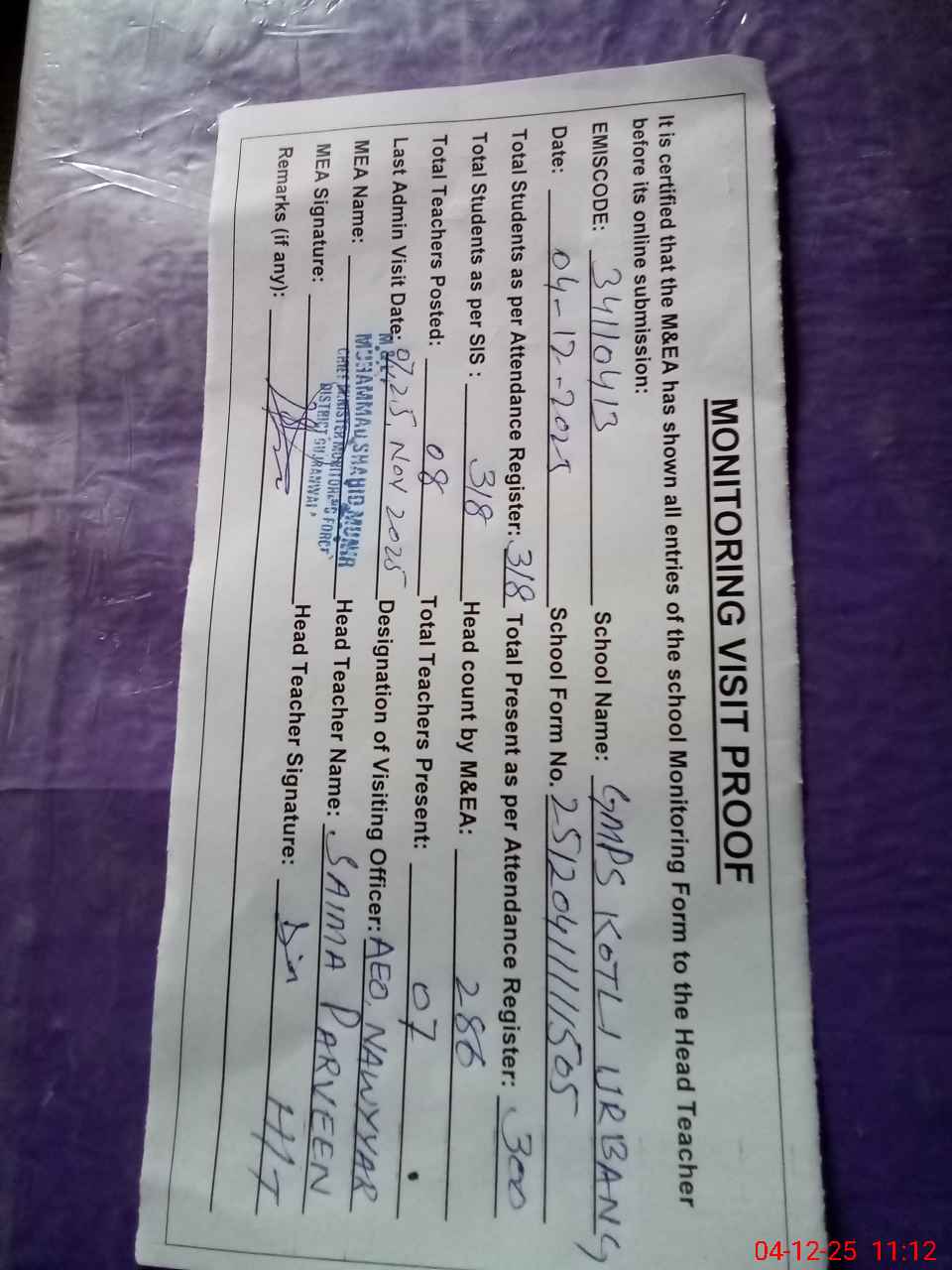 | Attendance Register | Head Teacher | MEA with School | Visit Proof |