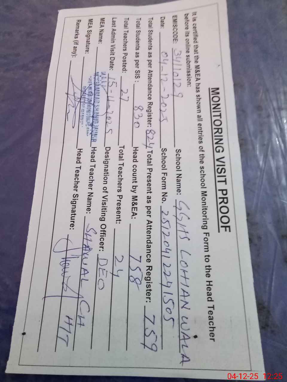 | Attendance Register | Head Teacher | MEA with School | Visit Proof |