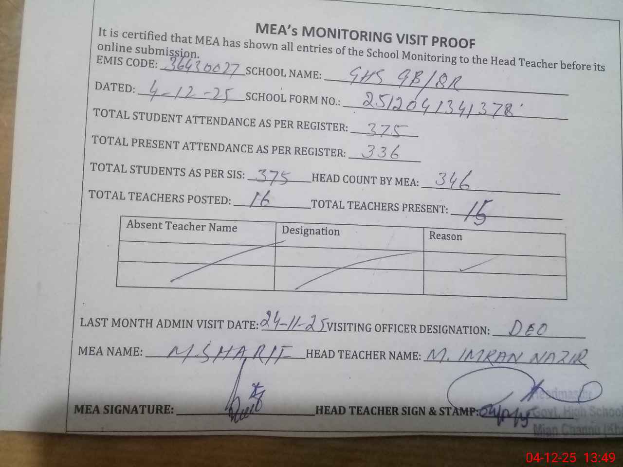 | Attendance Register | Head Teacher | MEA with School | Visit Proof |