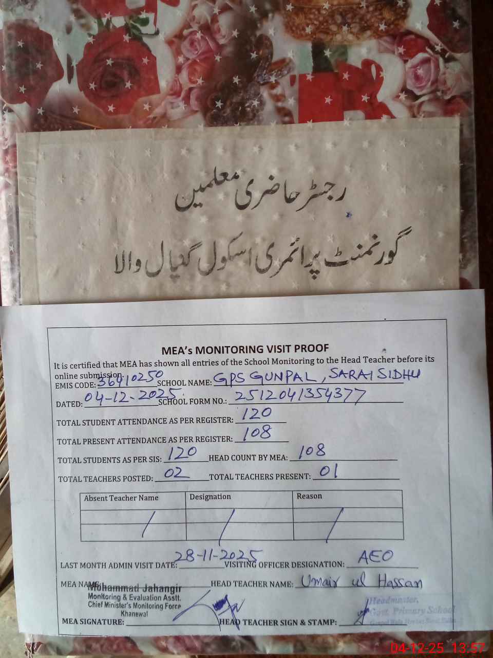 | EMIS Code: 36410250 | Name of School: GPS GUNPAL WALA, MOUZA HAVELI MUBARAK SHAH, SARAI SIDHU | |||