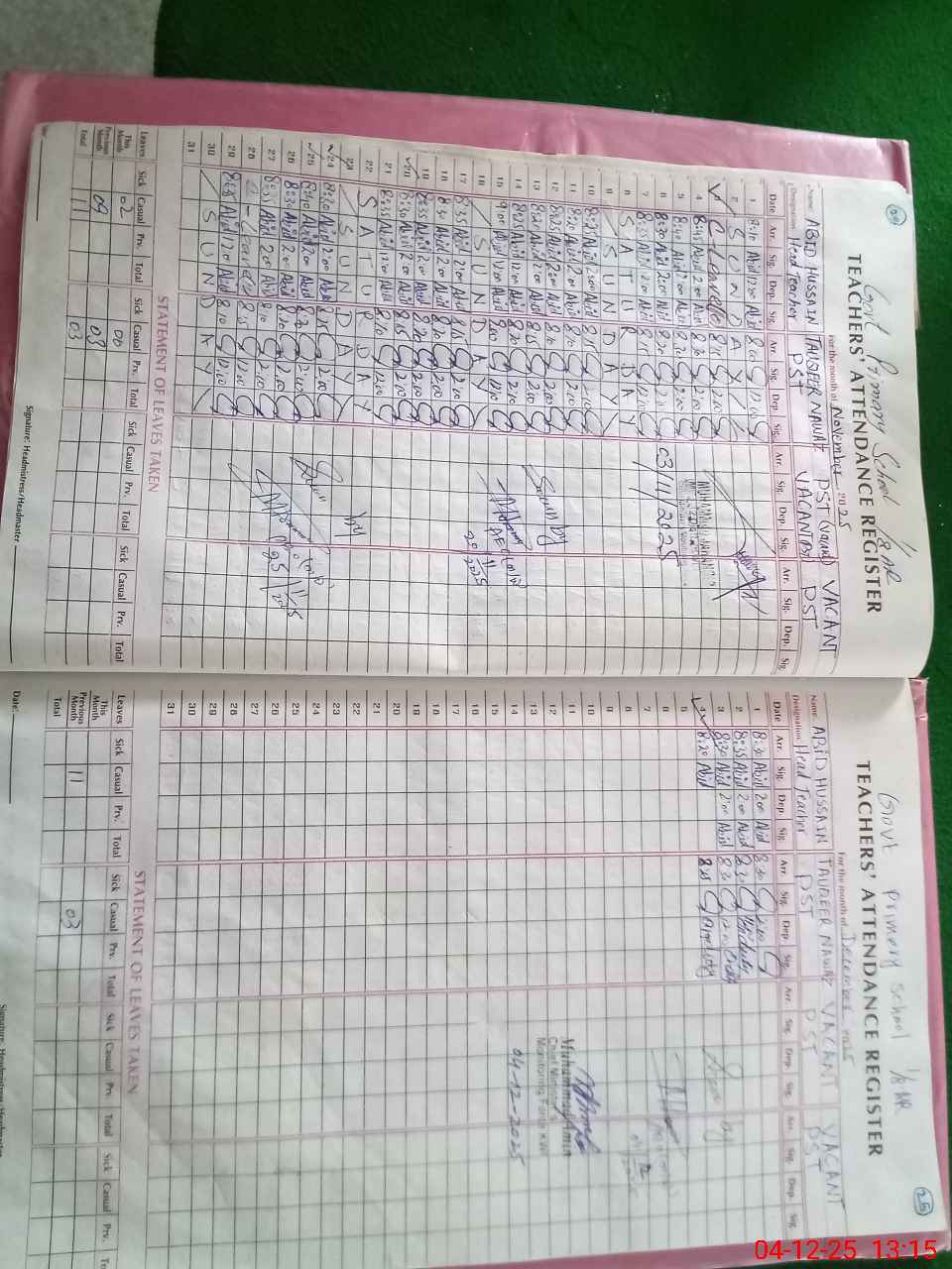 | Total no. of Classrooms: 4 No. of Classrooms Used for Teaching: 4 No. of Classrooms Storing Old Furniture, FTBs, etc: 0Comments if Any: FTF Record register not updated from October,2025 to November,2025 and bank account statement also not available |