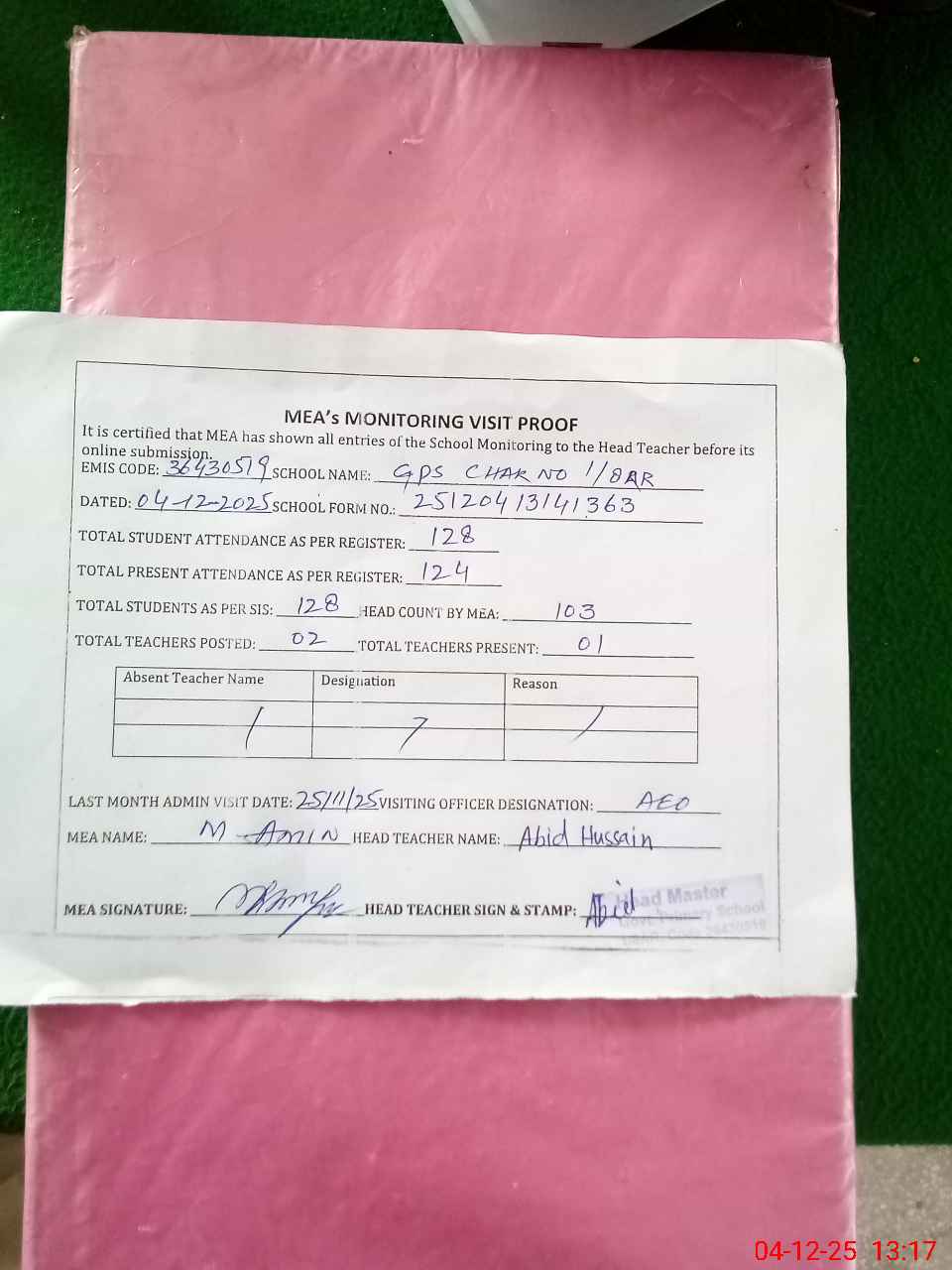 | EMIS Code: 36430519 | Name of School: GPS CHAK NO. 1/8-AR TULAMBA | |||