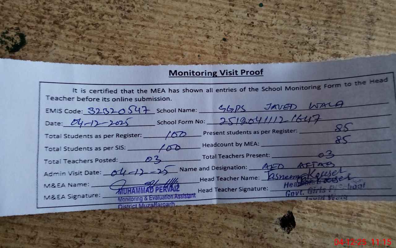 | EMIS Code: 32320547 | Name of School: GGPS JAVED WALA | |||