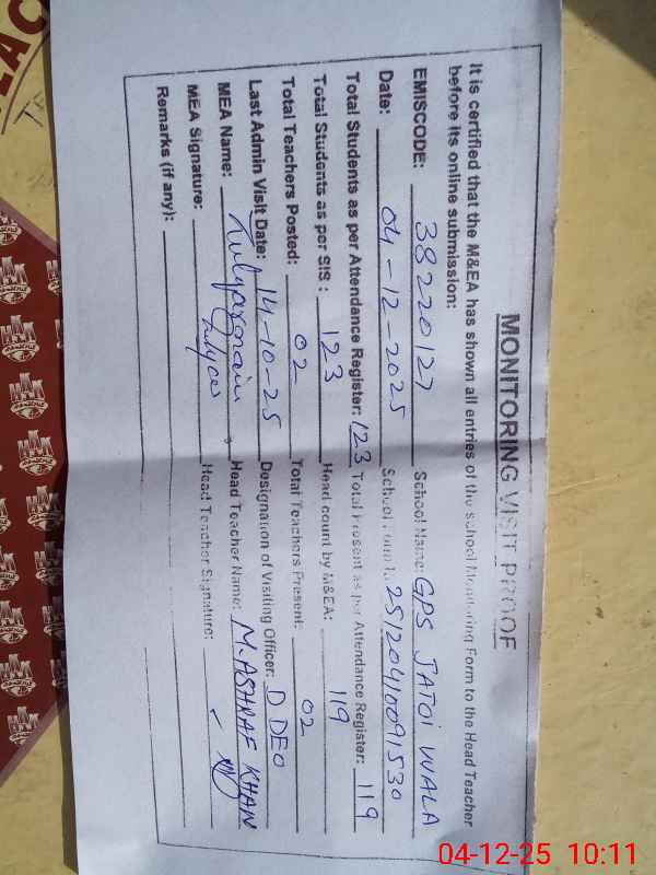 | EMIS Code: 38220127 | Name of School: GPS JATOI WALA | |||