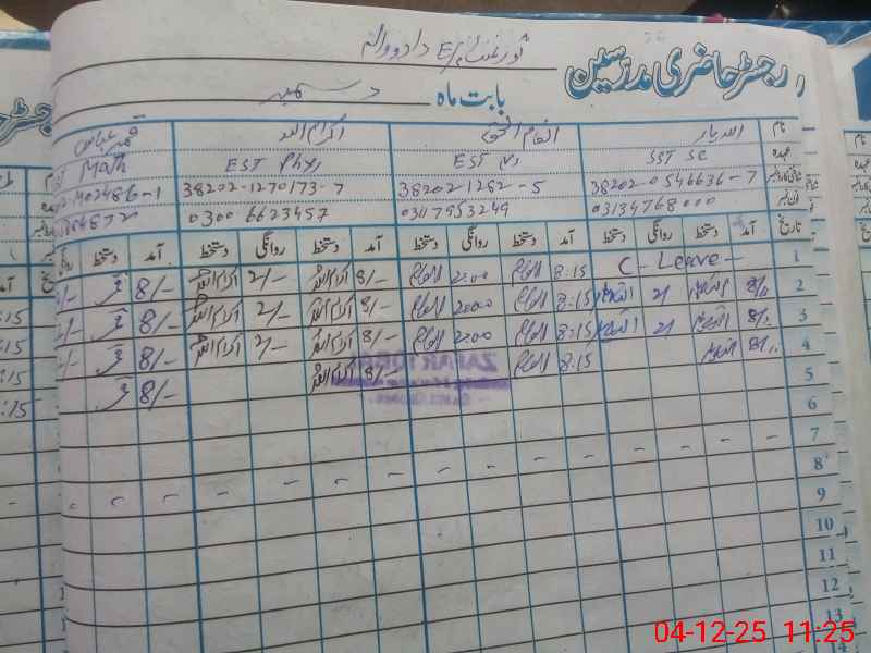 | CNIC | Full Name | Designation | R/C | Absence During Last Calender Month |