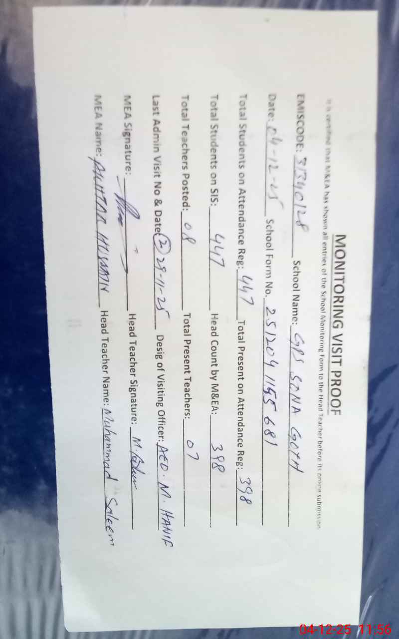 | EMIS Code: 31340128 | Name of School: GPS SONA GOTH FFC | |||
