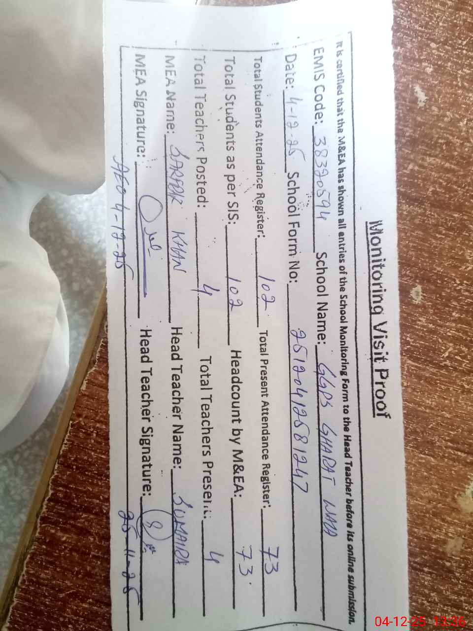 | Attendance Register | Head Teacher | MEA with School | Visit Proof |