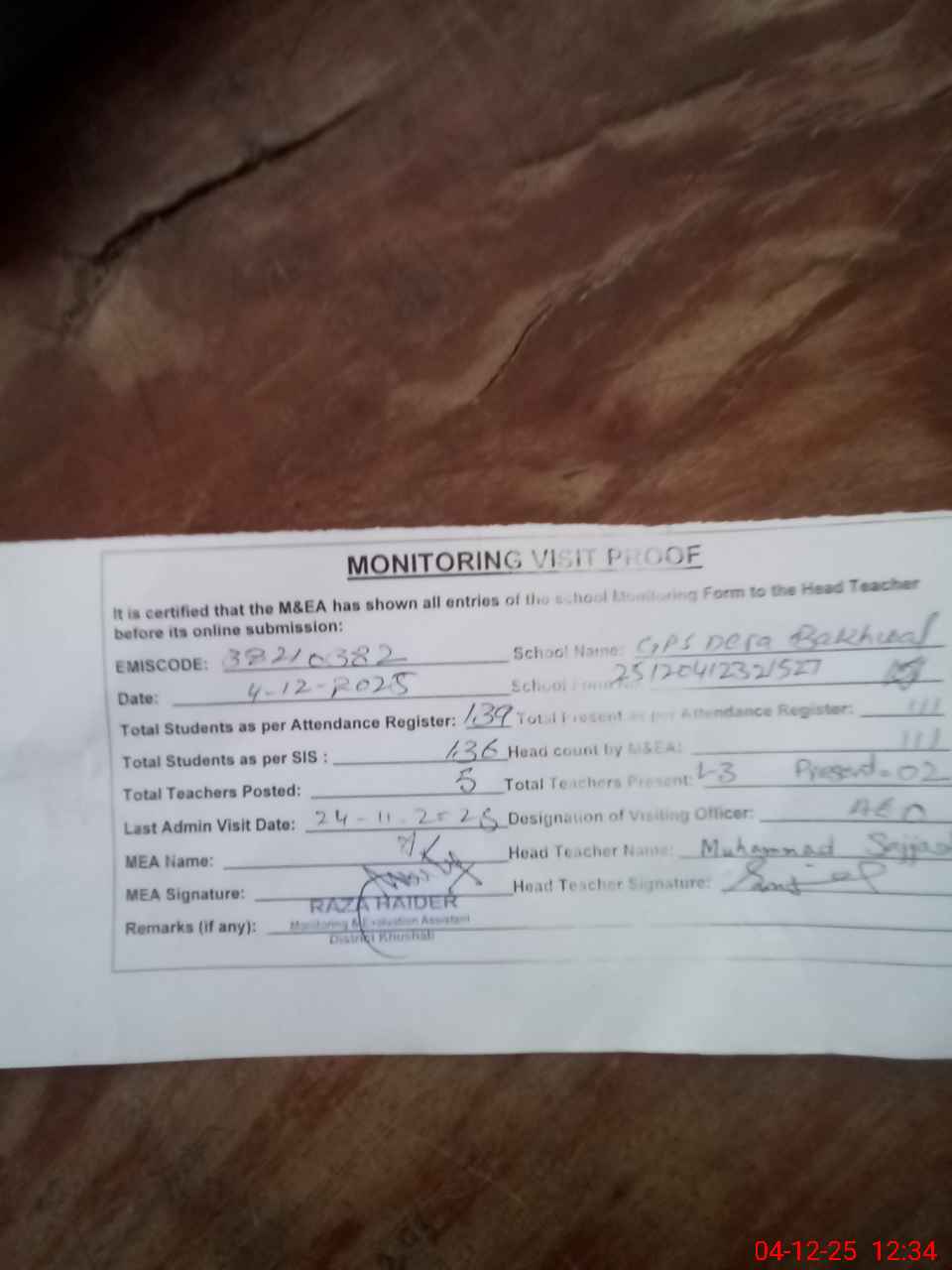 | Attendance Register | Head Teacher | MEA with School | Visit Proof |