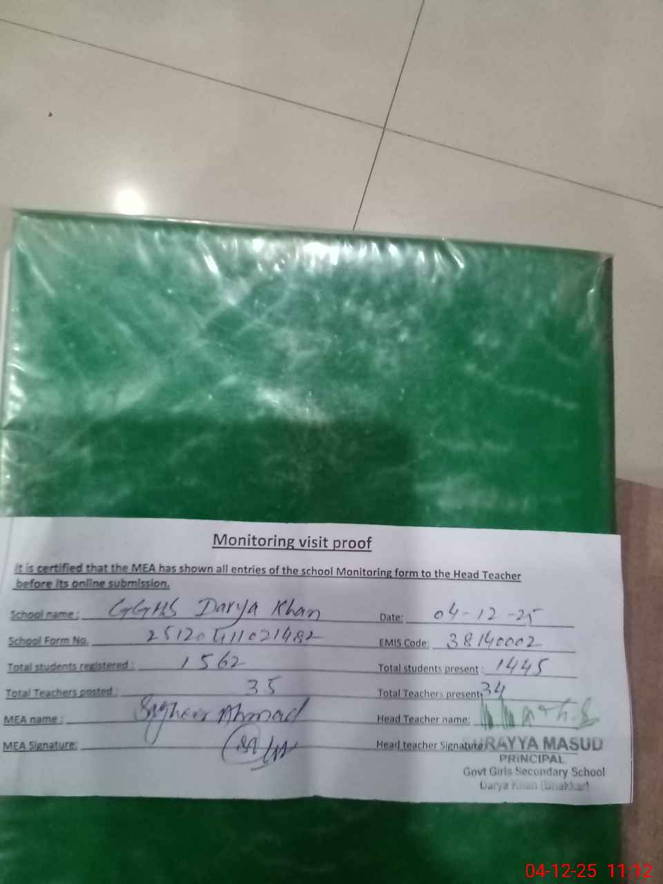 | EMIS Code: 38140002 | Name of School: GGHS DARYA KHAN | |||