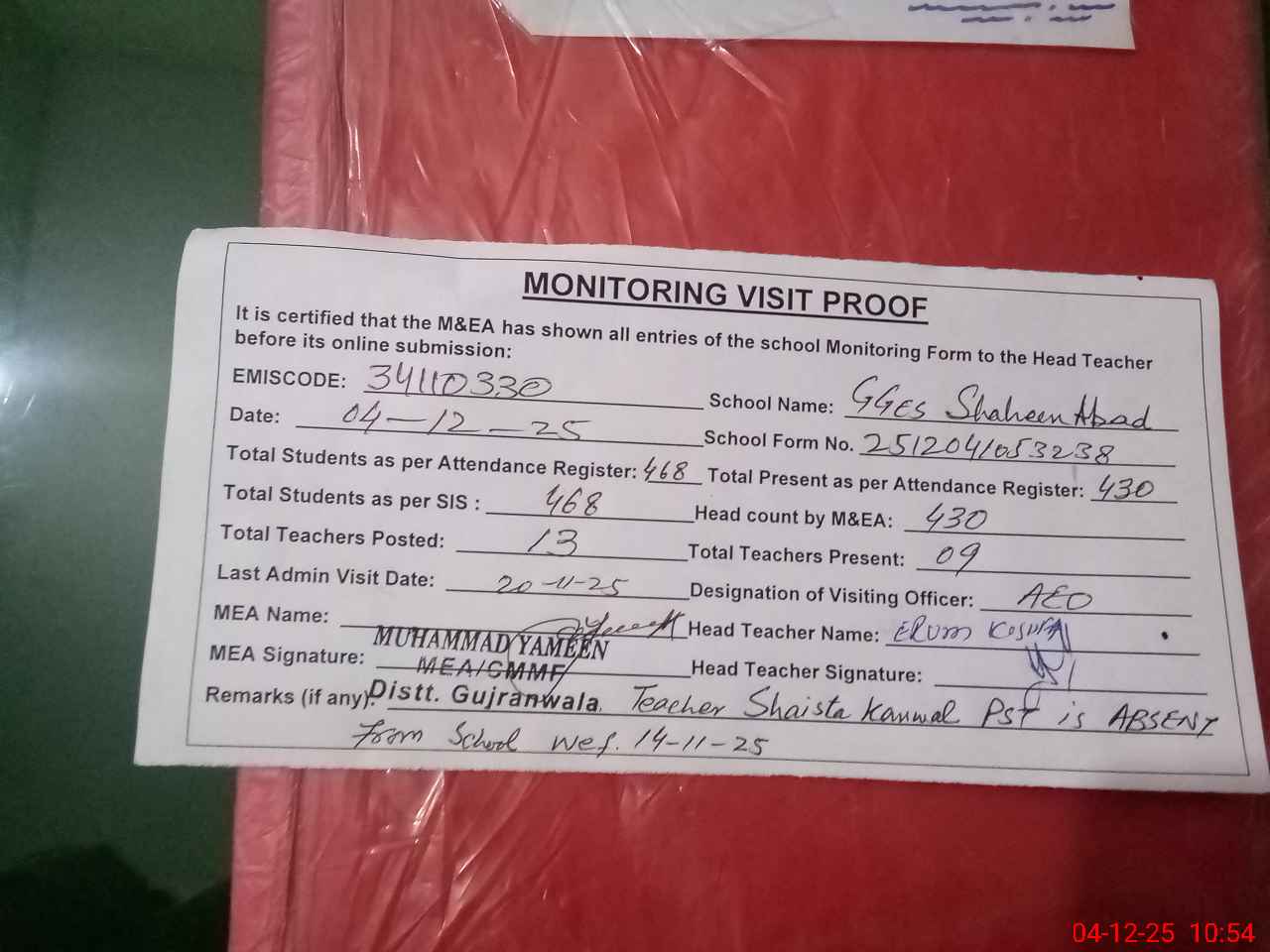 | Remarks (Use Separate Page if Required): Teacher SHAISTA KANWAL PST is ABSENT from school wef 14-11-2025 | |||||