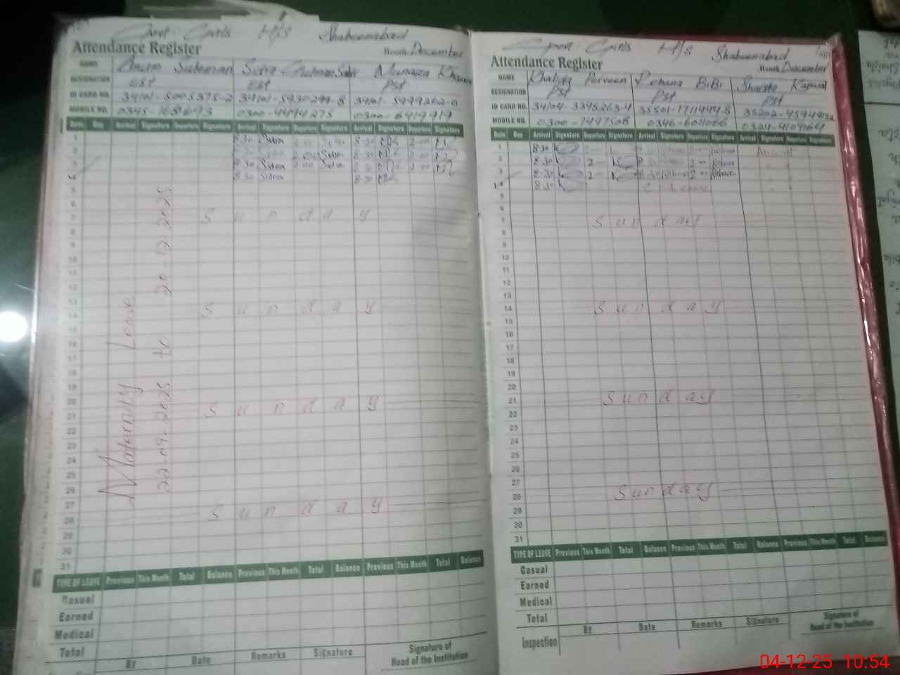 | CNIC | Full Name | Designation | R/C | Absence During Last Calender Month |