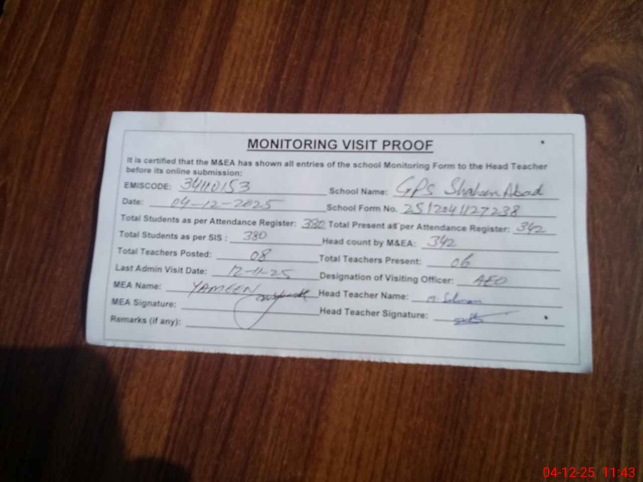 | EMIS Code: 34110153 | Name of School: GPS SHAHEEN ABAD | |||