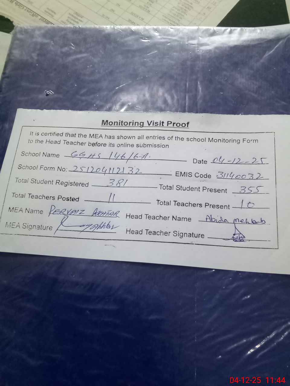 | Attendance Register | Head Teacher | MEA with School | Visit Proof |