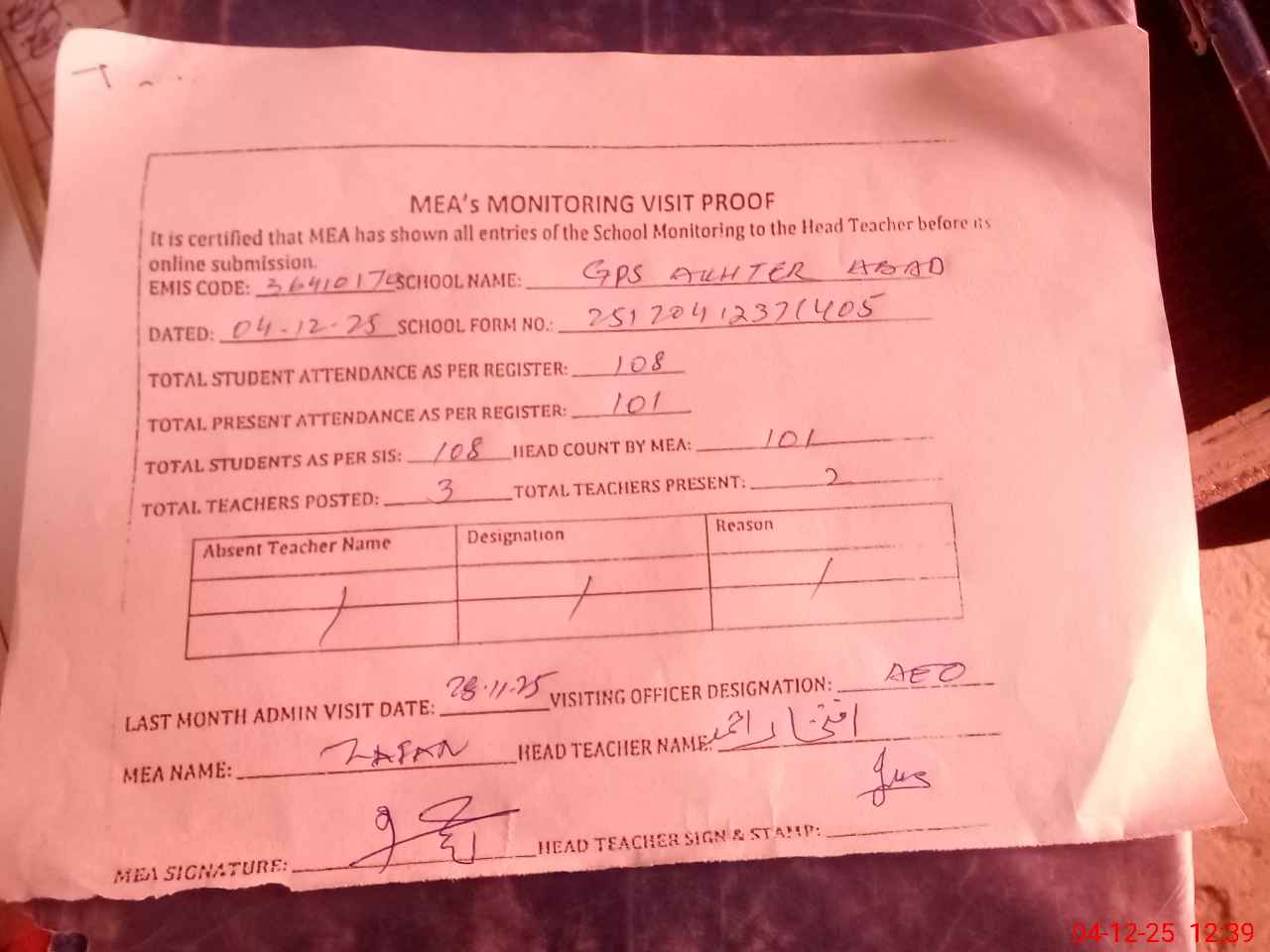 | Attendance Register | Head Teacher | MEA with School | Visit Proof |