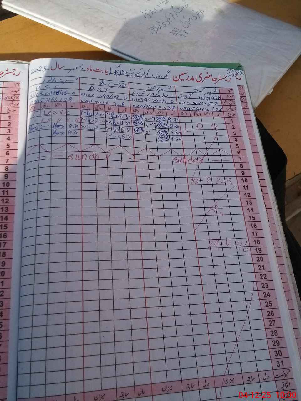 | CNIC | Full Name | Designation | R/C | Absence During Last Calender Month |
