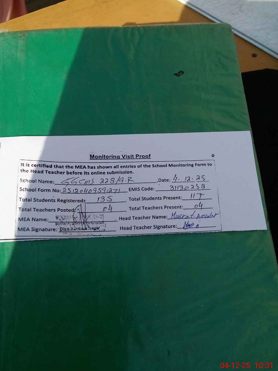 | Attendance Register | Head Teacher | MEA with School | Visit Proof |