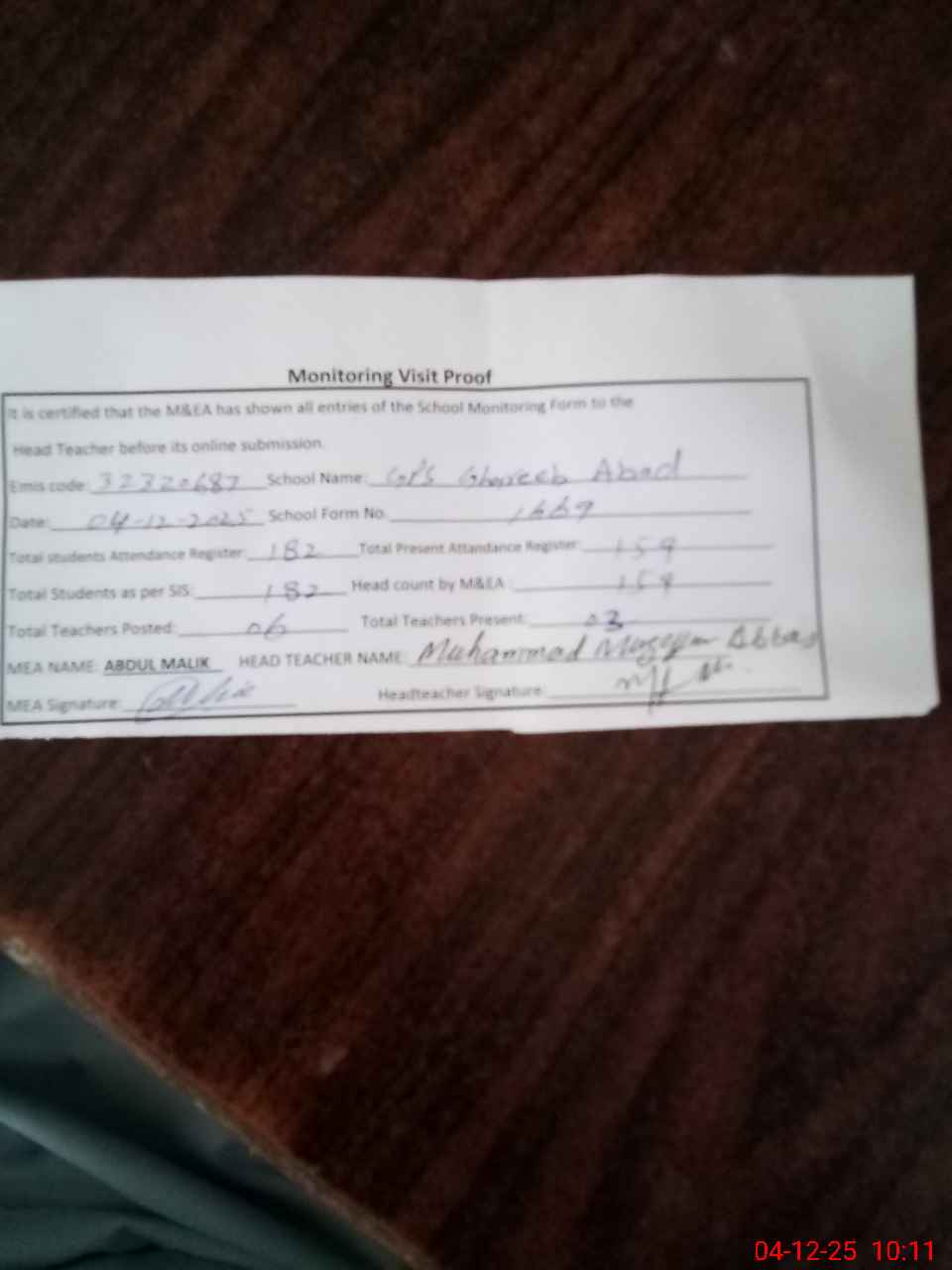 | Attendance Register | Head Teacher | MEA with School | Visit Proof |