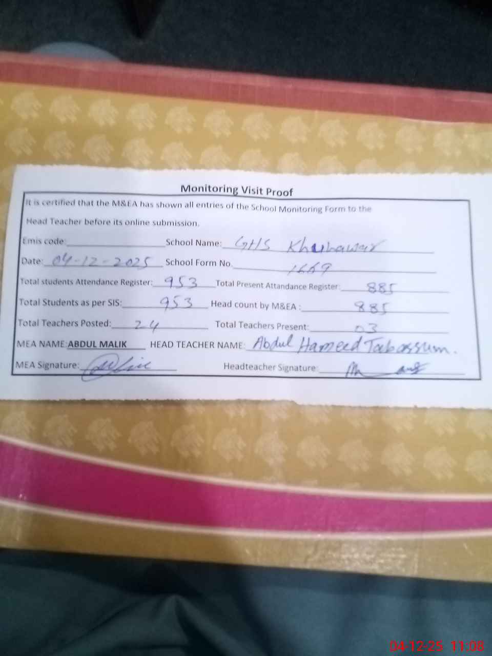 | Attendance Register | Head Teacher | MEA with School | Visit Proof |
