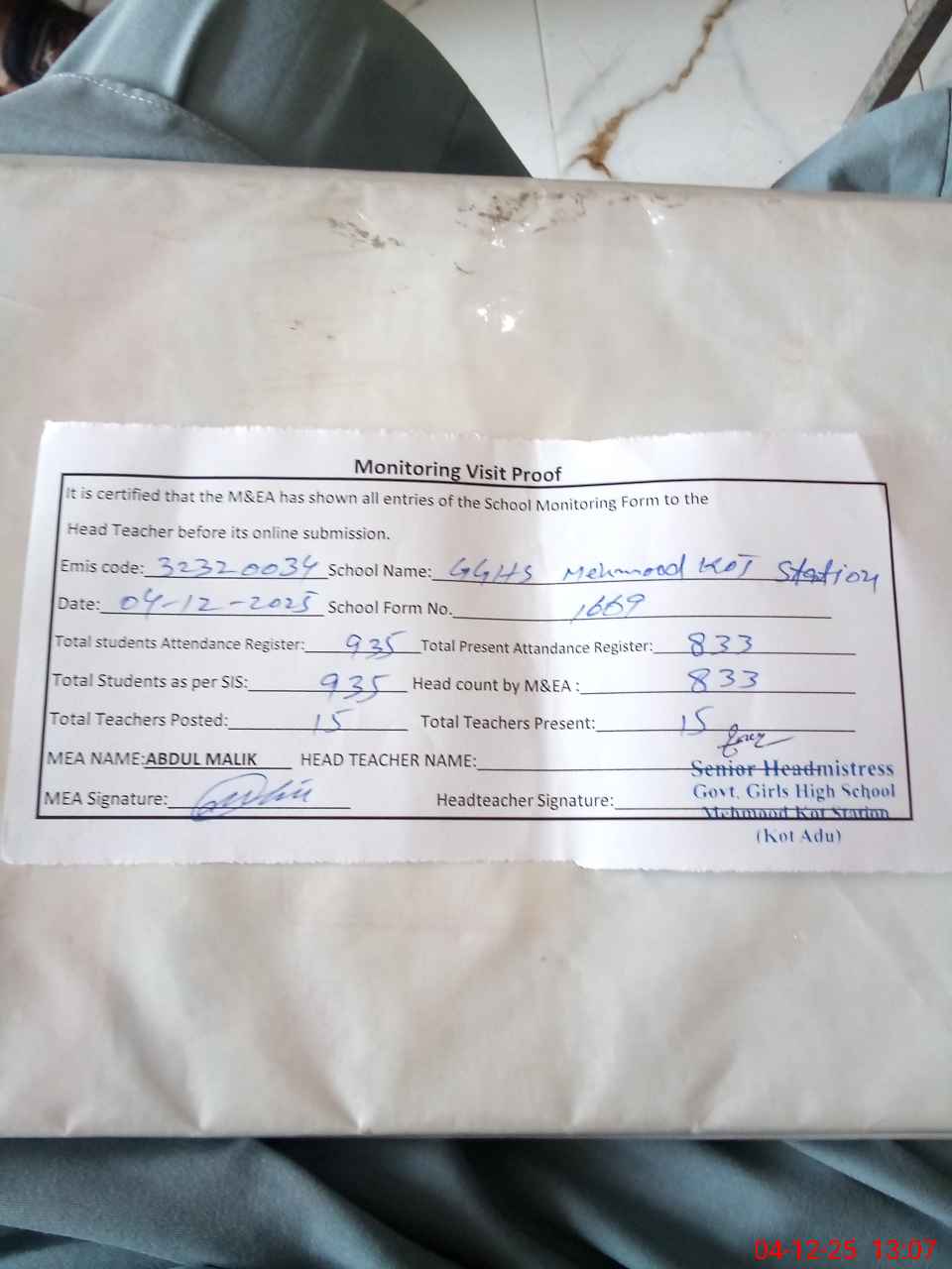 | Attendance Register | Head Teacher | MEA with School | Visit Proof |