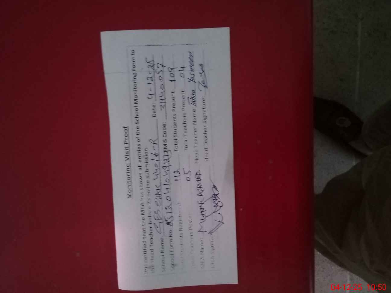 | Attendance Register | Head Teacher | MEA with School | Visit Proof |