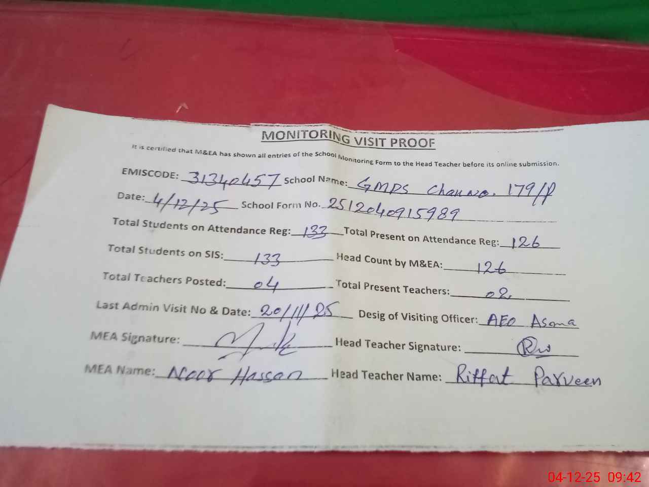 | Attendance Register | Head Teacher | MEA with School | Visit Proof |