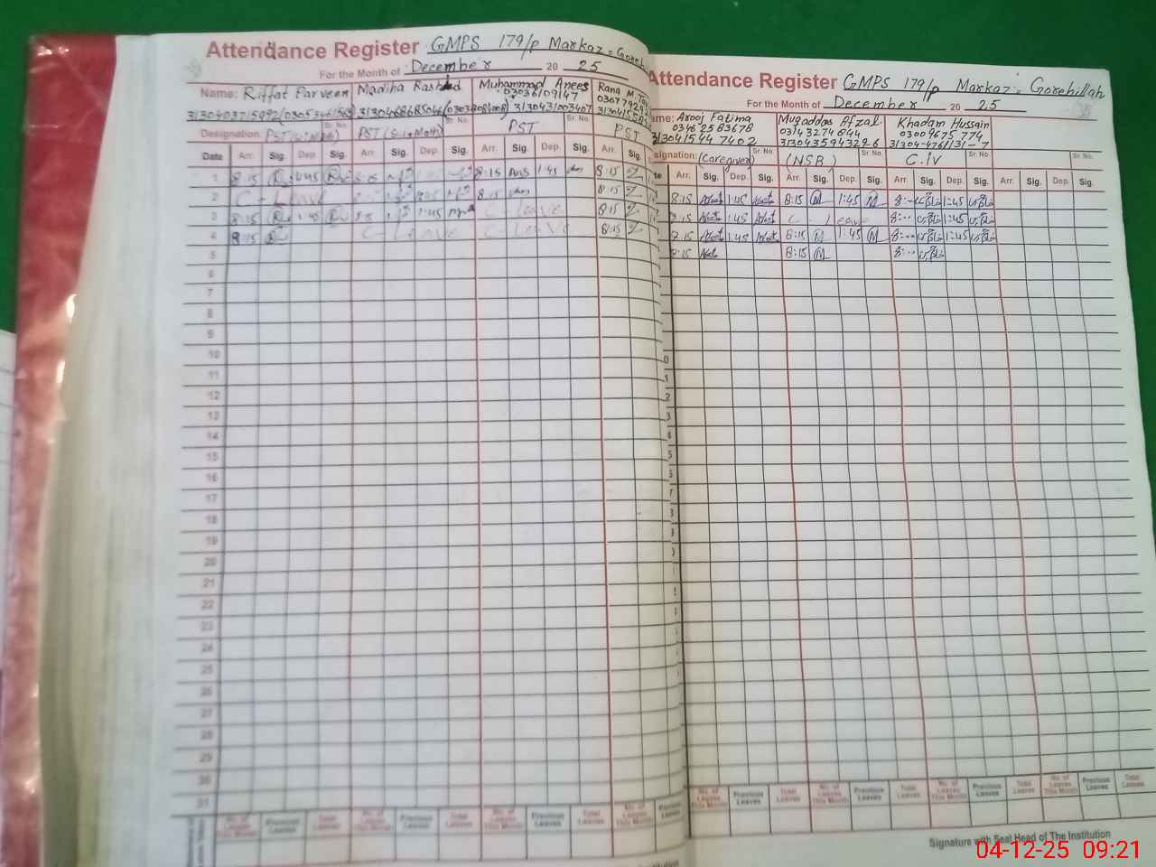 | CNIC | Full Name | Designation | R/C | Absence During Last Calender Month |