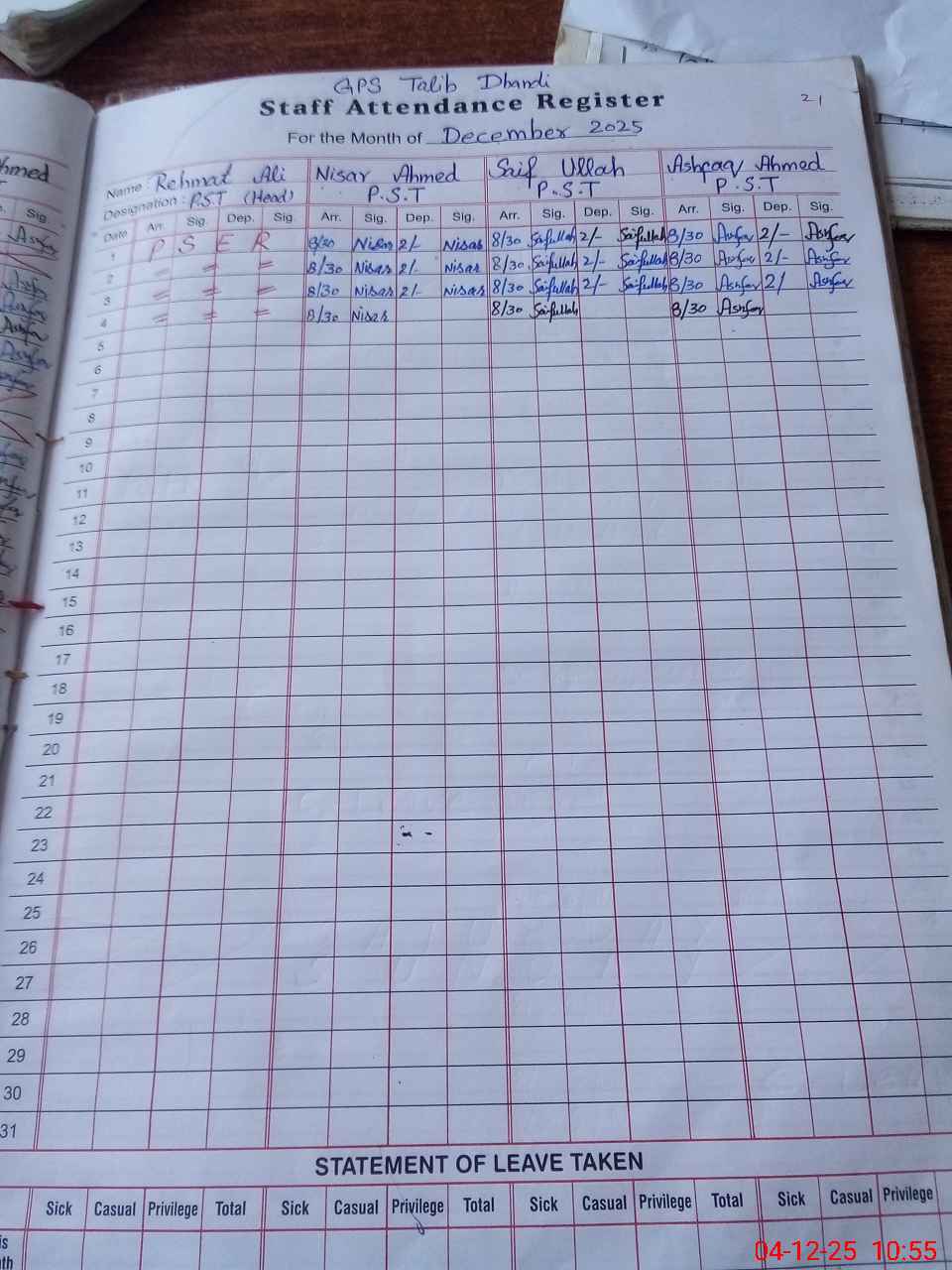 | CNIC | Full Name | Designation | R/C | Absence During Last Calender Month |